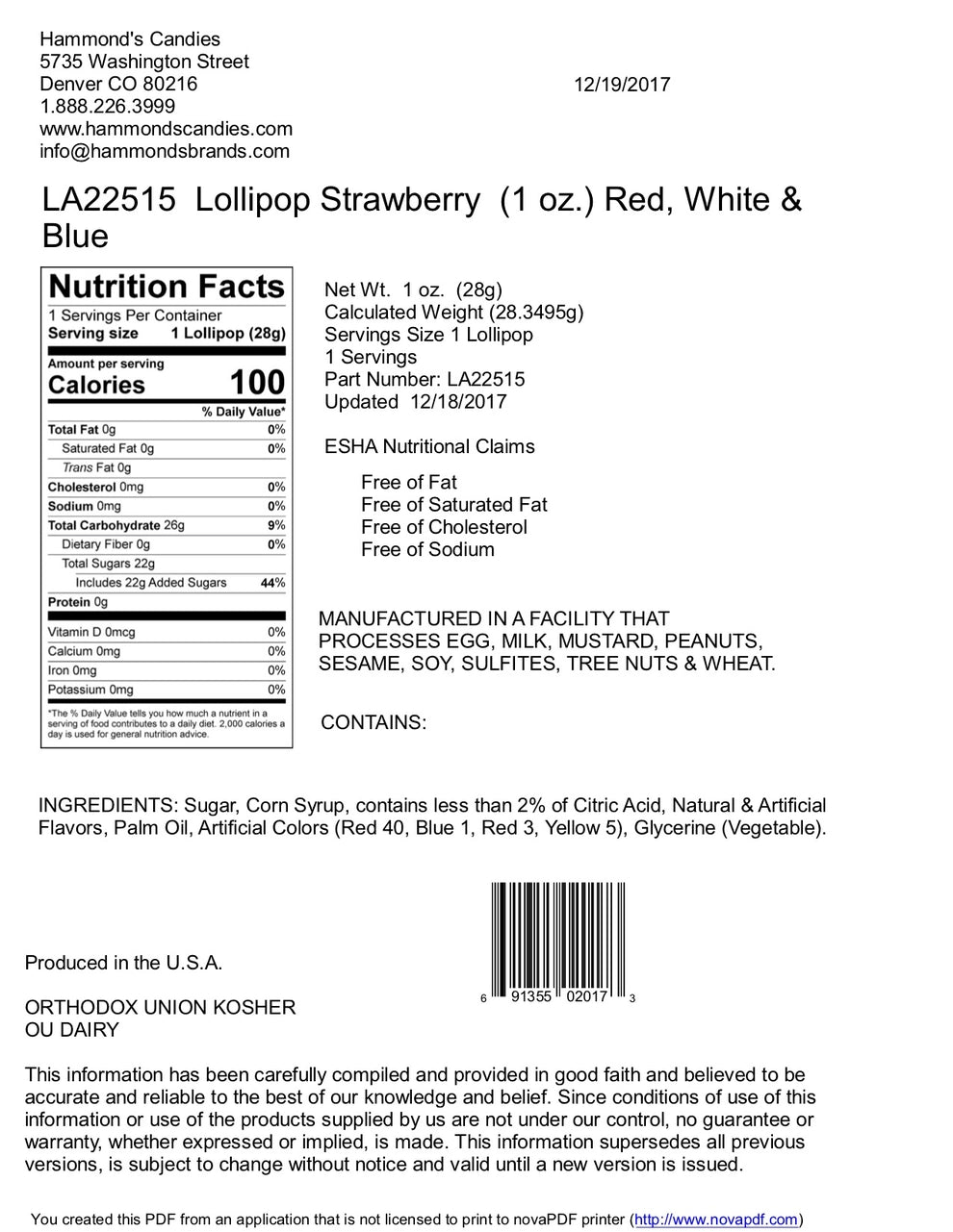Hammond’s Strawberry Lollipop delivers a juicy burst of classic berry flavor, striking the perfect balance between sweet and bright. With its red, white, and blue twist, it’s a summertime standout—ideal for Fourth of July assortments, seasonal impulse bins, and nostalgic fruit-themed bundles.