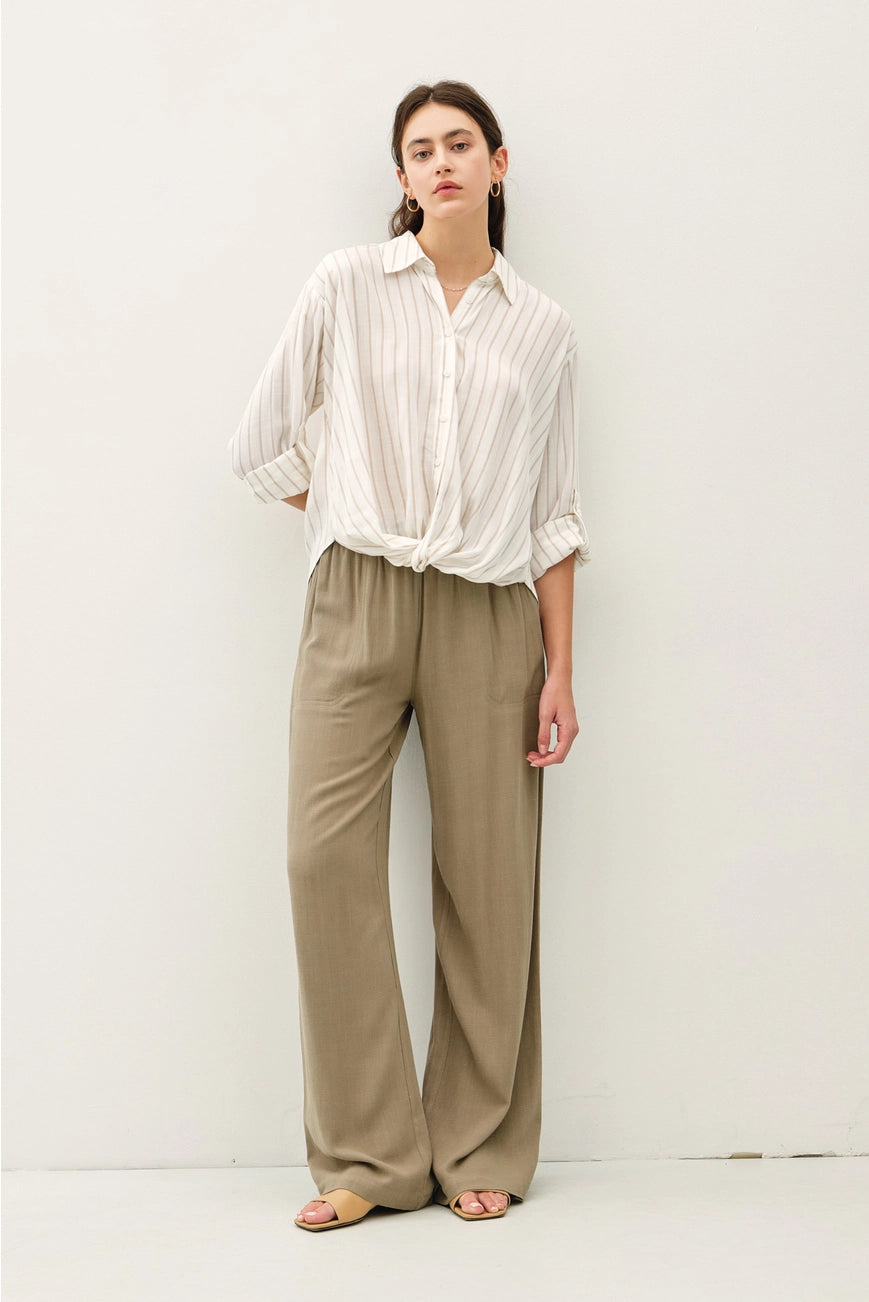 Description: Button up shirt with long, rolled up sleeves. Featuring a front twist detail and rounded hemline. Perfect for Fall weather!